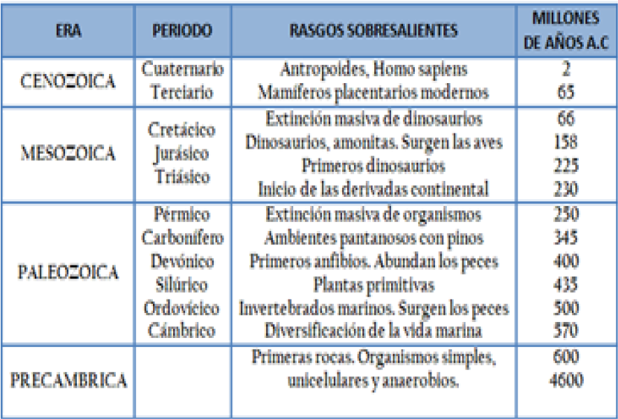 En la siguiente tabla se presenta un resumen de los acontecimientos más importantes observados durante cada una de las eras presentadas anteriormente: