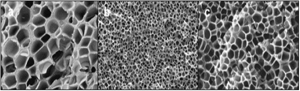 Figure 3. Cell morphologies: (a) PS foam (scale bar 50 µm, Cell size: 20 µm; Cell density: 8,23x107), (b) PS/1%CNFs nanocomposite foam (scale bar 20 µm, Cell size: 2.64 µm, cell density: 2,78x1010), (c) PS/%0.1 CNTs nanocomposite foam (scale bar 20 µm, Cell size: 7,11µm, Cell density: 1,44x109) [10]