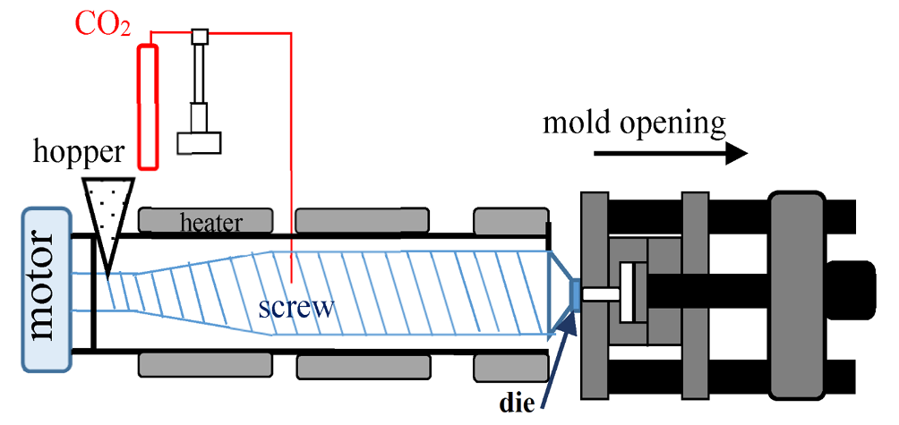 Molding injection technique, which is a widely used polymer foam production technique, consists of gas degradation, cell nucleation, cell growth and product shaping steps. A schematic view of a typical foam injection molding device is given in Figure 5. The basic elements of an injection machine are a hopper, an injection screw, the heaters and a mold, respectively. In the molding injection method, the foamer is injected into the molten polymer from the foamer inlet [6,10]. The polymer is injected from the hopper as shown in the figure 6.