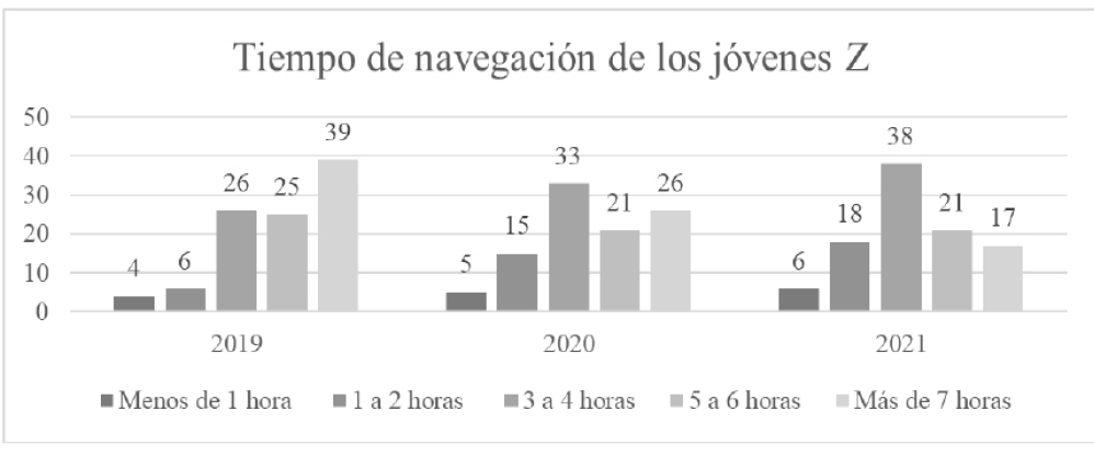 En las tres etapas de análisis los jóvenes Z afirmaron usar las redes sociales en un 99.3%. El dispositivo preferido para conectarse a las plataformas virtuales fueron los teléfonos inteligentes o smartphone, además, de contar con al menos 2 dispositivos con acceso a internet. Con base en los resultados, llama la atención en la Gráfica 1, la disminución en el período de navegación, debido que, en el año 2019 la tendencia mayoritaria era navegar más de 7 horas al día en las redes sociales.