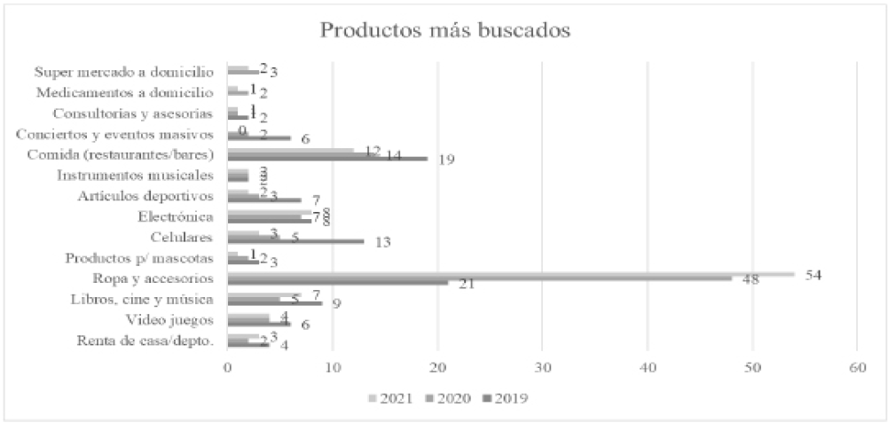 La frecuencia de compra de los jóvenes Z fue baja en los años 2019 y 2020, al mostrar que “nunca realizaban compras” virtuales en un 47-55% de los casos, lo cual es entendible, debido a que estos jóvenes dependen para gastar de sus padres o tutores. Sin embargo, en el 2021 se redujo significativamente el “nunca compro” a 24% (o sea un 76% si realizó compras por internet) al realizarlas de manera digital al menos de 1 a 2 veces cada mes o cada 2 meses en el año 2021. Por otro lado, llama la atención el incremento de consumo en los productos deportivos; quizás esta actividad es la que restó parte del tiempo que anteriormente invertían en navegar en las redes sociales, al comenzar a realizar ejercicio en casa. En adición, las clases virtuales o híbridas de la Universidad, también restaron tiempo al uso dedicado a las redes sociales.