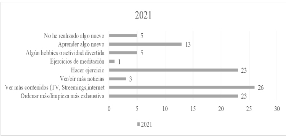 Los jóvenes Z consideran que los cambios traídos por el Covid-19 al mundo fueron negativos, (43%) sin embargo, una parte mayoritaria consideró que los cambios a consecuencia de la pandemia fueron positivos (57%). Los resultados se pueden observar en la Gráfica 9. El aislamiento social impulso nuevos hábitos y actividades por parte de la humanidad y en este caso para los jóvenes Z su actividad predilecta fue ver contenido (T.V. Streamings, internet). Las otras actividades fueron “hacer ejercicio” y poner “orden y limpieza” en su cuarto /casa.