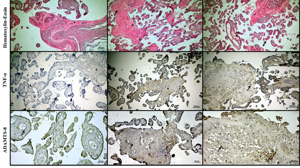 Material and methods: A total of twenty-four pregnant women (8 patients per each group) were included in the study. Their placentas were processed for routine paraffin wax embedding protocol. The blood parameters of patients were recorded. Placental tissues were stained with hematoxylin-eosin dye and immune stained with TNF-α and ADAMTS-8. Statistical analysis was performed on blood and histological parameters.