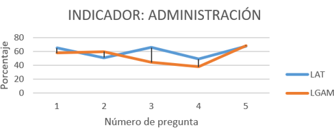 Los porcentajes más altos obtenidos corresponden a la licenciatura de administración turística respecto de las respuestas a las preguntas 1, 2, 3, y 4 del indicador administración, pues en el proceso de enseñanza-aprendizaje el programa de estudios está diseñado por áreas de conocimiento económico-administrativas.
