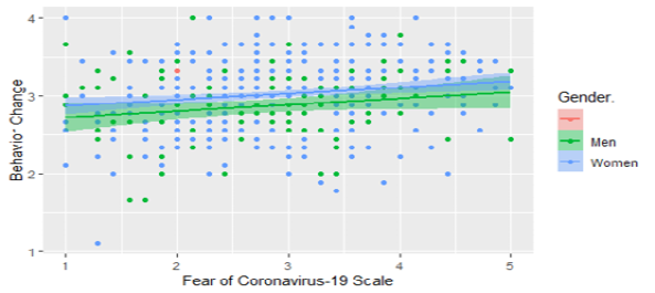 Linear regression analysis for multiple variables affecting individual health behavior showed that Health Behavior = 2.79 + 0.079 * Fearcovid19 - 0.142 * Sex (men). Fear and Sex factors explained the 4% (R2-adj= 4%) of individual behavioral changes during the Covid-19 pandemic, which is showed in figure 2.