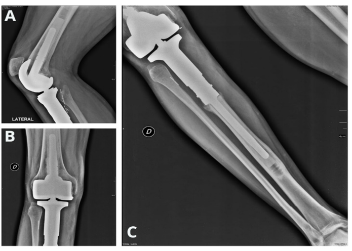 Figura 2. Radiografía de control del miembro inferior derecho un año después de la intervención. A. Vista lateral del remplazo parcial de la articulación. B Vista frontal del remplazo parcial de la articulación y epífisis proximal de la tibia. C. Vista frontal total del reemplazo parcial de la articulación, epífisis y parte de la metáfisis proximal de la tibia.