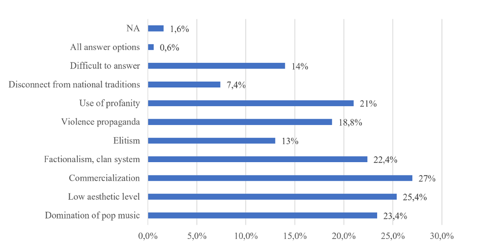 The results demonstrated no steady representations of the negative and positive features of urbanized culture amongst the participants. The initial group oftentimes is referred to accessibility (31.80% of participants), inclination toward the benefits of an “regular” person (28.60%) and a diversity of forms (27.80%). Amongst the undesirable ones are the culture commercialization (27%), a low aesthetic level (25.40%), the pop music dominance (23.40%) (Fig. 1a, b).