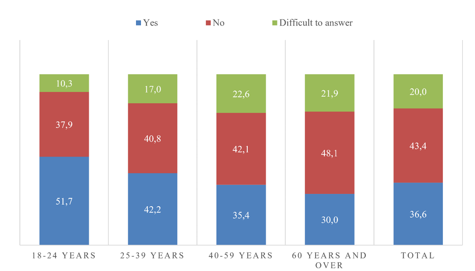 Respondents of the mass survey didn’t arrive at a common notion in evaluation the influence of information technologies and tools on the cultural procedure. 36.60% of them stated the gadgets and tools make the culture more in need, 43.4% said opposite. The most optimistic were the youth: 51.70% related the development in need for culture with the utilization of technical tools (Figure 3).