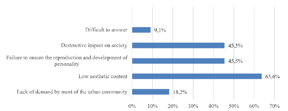 Over the course of the research, the experts have been inquired to state their attitude toward the issue of «cultural waste». 73.30% distinguished it crucial and acknowledge it likely to utilize this notion associated with some cultural proces’s products in the city. In the meanwhile, merely 36.70% expressed that nowadays, there stand more or less vivid standards making it likely to recognize it in the composition of urbanized cultures. Experts recommended as such factors: low aesthetic content of products (63.60%), destructive effect on society (45.50%), and incapability to guarantee the development and reproduction of personalities (45.50%) (Figure 6).