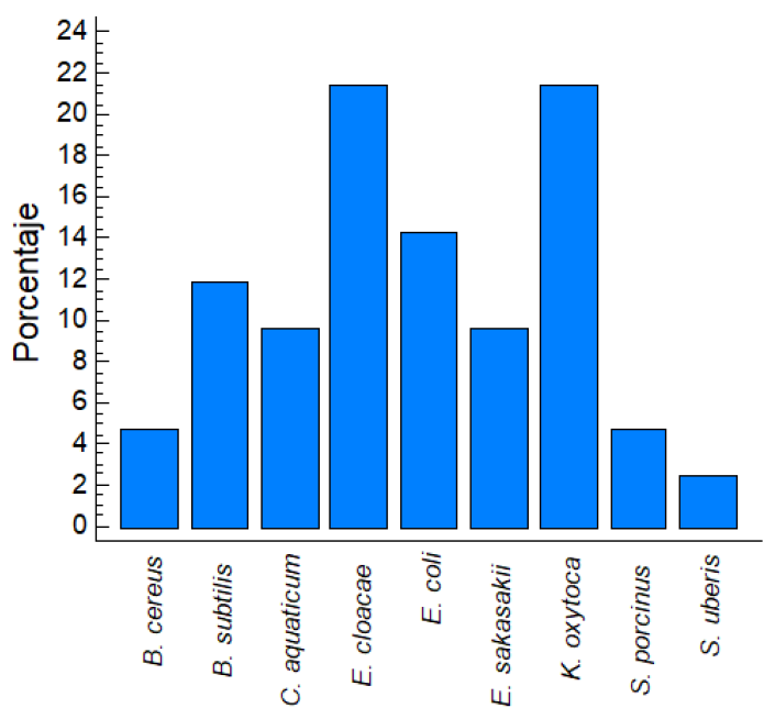 Figura 1: Porcentajes de las frecuencias relativas de las especies de bacterias encontradas en las muestras de agua.