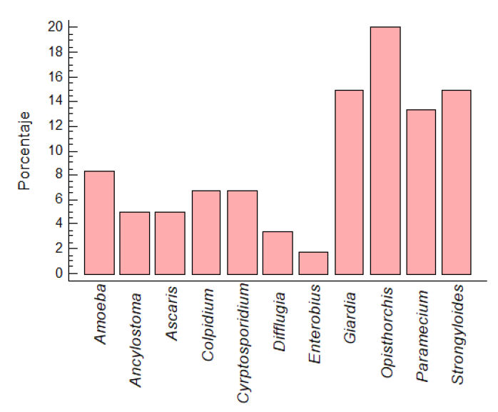 Se encontraron 9 especies de bacterias, siendo Enterobacter cloacae y Klebsiella oxytoca las especies más frecuentes con un 21,43%, seguida de Escherichia coli con un 14,29% y la menos frecuente fue Streptococcus uberis con un 2,3% (Figura 1). En los parásitos se encontraron 4 géneros pertenecientes a helmintos y 7 géneros de protozoos de agua dulce, estos se pudieron clasificar por morfología y micrometría, siendo el género Opisthorchis sp (Fig4-D) el más frecuente con un porcentaje del 20%, seguido de Strongyloides sp (Fig4-C) y Giardia sp con el 15 %, el menos frecuente fue Enterobius sp con un 1,6% (Figura 2). Aparte de las bacterias y parásitos encontrados en las muestras, se identificaron 7 géneros de algas y a su vez 2 tipos de diatomeas, las más frecuentes fueron las diatomeas pennadas (Fig. 4-F) con un 47,5 %, seguido del género cf Melosira ( Fig. 4-E) y cf Navicula ambos con el 15% (Figura 3). En la Figura 4 se pueden observar tanto huevos como larvas de los diferentes géneros de parásitos y también algunas de las algas encontradas.