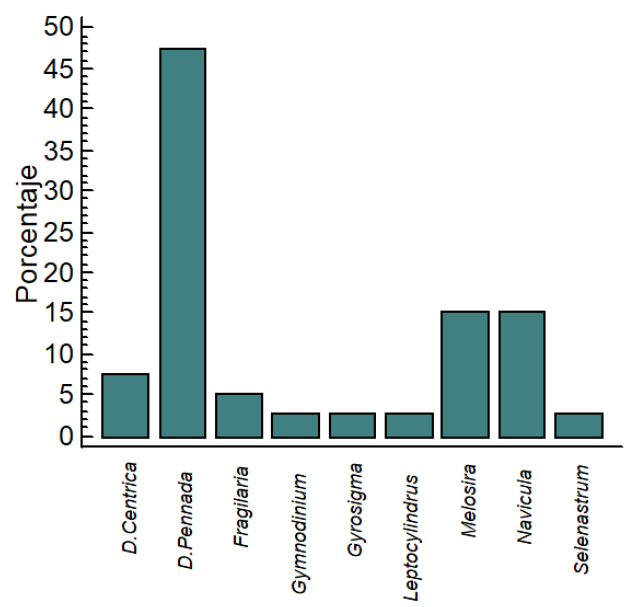 Figura 3: Porcentajes de la frecuencia relativa de los géneros de algas encontradas en las muestras de agua.