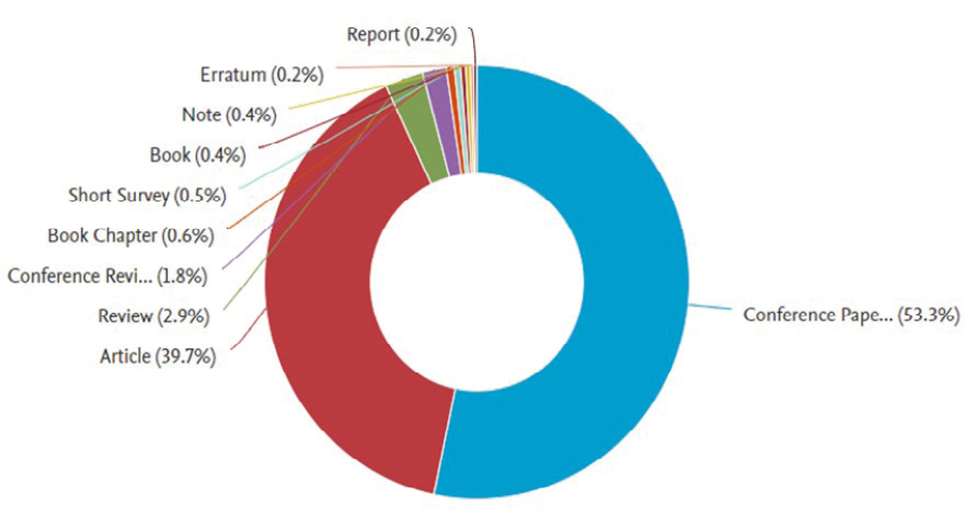 The highest percentage of documents published are through conference paper with a participation of 53.3% (440 documents), with 39.7% being publications through Article (328 articles published).