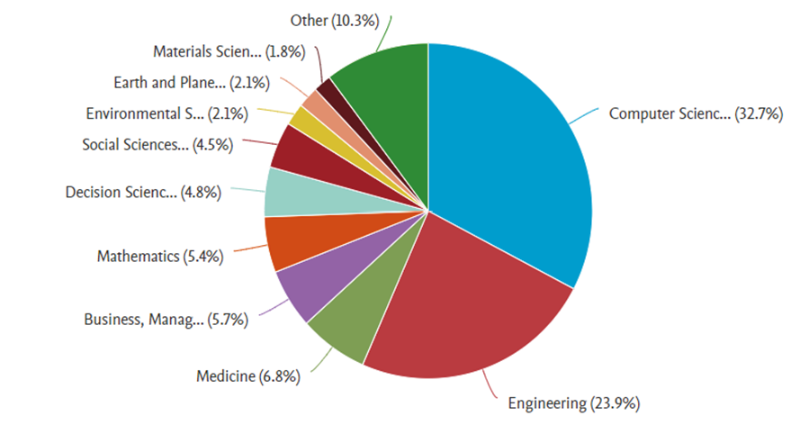 About 55% of the published articles have been studied in the areas of Computer Science and Engineering. The other documents have been published in areas such as Medicine, Business Management, Mathematics, and Decision Science, Social Sciences, and Environmental science, Earth and planet, Materials Science with participation and other areas of knowledge.