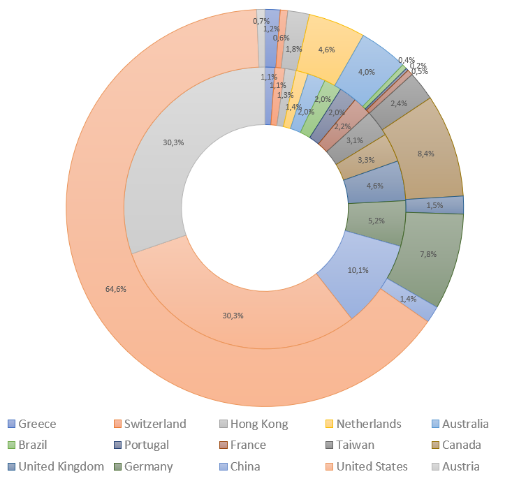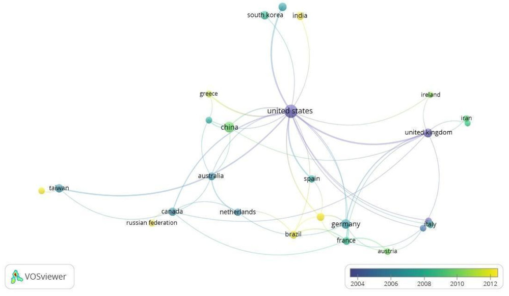 Figure 12 displays the relationship that has occurred between countries thanks to the co-authorship presented in the different published articles. Co-authorship between the United States, Canada, Germany, and the Netherlands stands out.