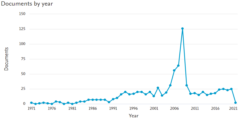 Publications in the area have been viewed since 1971. In general, the number of documents published annually ranges from 1 to 25. However, a significant increase occurred in 2007, 2007 and 2008, so exceptionally, 125 articles were published.