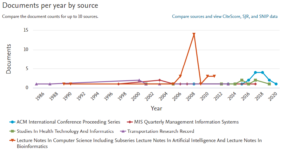 The main sources of publication in the area are ACM International conference Proceeding Series, MIS Quarterly Management Information Systems, Studies in Health Technology and Informatics, Transportation Research Record, Lecture Notes in Computer Science Including Subseries. Lecture notes in Artificial Intelligence and Lecture Notes in Bioinformatics. It should be noted that this last journal made a significant contribution to publication in 2008, and since 2011 it has not registered publications. Additionally, since 2017 the publications in the journal ACM stand out from the other journals. See figure 2.