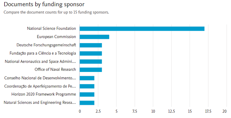 The main sponsor to the publication of these articles is the National Science Foundation, with almost 17 publications. Followed by the European Commission with around 4 articles. Then, Deutche Forschungsgemeinschaft, Fundacao para a Ciencia a Tecnologia, National Aeronautics and Space Administration, Office of Naval Research, sponsoring 3 articles. Finally, Conselho nacional de Desenvolvimento, Coordinates of Aperfeicoamento, Horizon 2020 Framework Program, Natural Sciences and Engineering Research, supporting 2 articles. See figure 6.