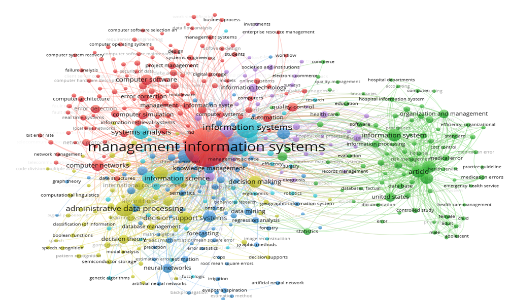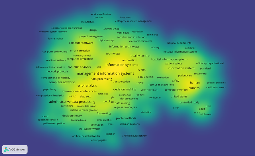 Six clusters represented by the strongest relationships between keywords were consolidated. The clusters considered are the first cluster management information systems-computer science (116 items), the cluster health field (85 items), information systems and computational environment applications (76 items), administrative data processing (57 items), decision-making (38 items), and technology industry 4.0 (38 items). The relevant keywords associated with errors or mistakes are error correction, error detection, failure analysis, fault detection, fault tolerance, fault tolerant computer, human errors, medical error, medical errors, medication error, medication errors, error statistics, estimation errors, error analysis, error rate, error rates, errors, missing data, and human error.