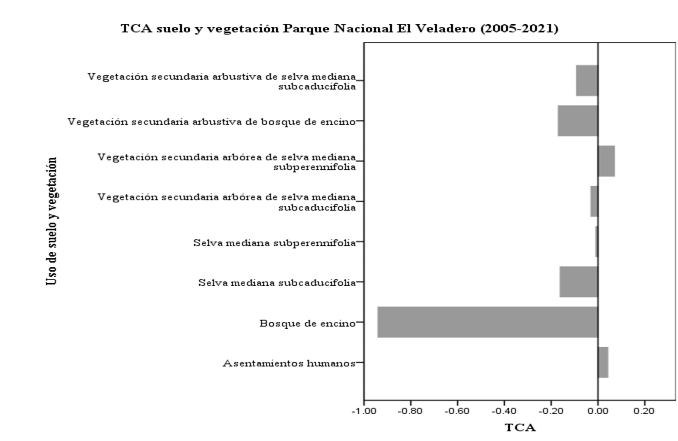 Se realizó un análisis multitemporal en un periodo de 2005 y 2021 para determinar cómo han cambiado los usos de suelo y vegetación del Parque Nacional El Veladero y su relación con la ciudad de Acapulco. Se usó el indicador Tasa de Cambio Anual (TCA), el cual mide la velocidad de transformación de la vocación del suelo y aproxima de forma hipotética a posibles problemas de ocupación, colonización y variaciones del recurso edafológico a lo largo de un tiempo determinado.