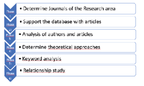 The present investigation adopted the approach of systematic review of the literature and combined bibliometric and Meta-Analytic analysis, which is a research process that requires compliance with the standards of the scientific method: objectivity, systematization and replicability compared to the usual reviews of the literature. research, also named qualitative or narrative reviews as opposed to a meta-analysis that allows the quantification of research results and are analyzed in this way for our case study in the Creative Industry, which shows, uses and describes the methodology in the studies (Ayaviri-Panozo et al., 2019), (Díaz-García et al., 2015), (Bužavaitė et al., 2019) y (SAUCEDO-ESTRADA HAEL K.; AYAVIRI ALBERTO, 2017) . The articles included in this study were identified through a search carried out in the Web of science database 2017-April 2022. It reports that six phases were applied, which are described below: (1) Determine journals in the research area; (2) Support the Database with articles; (3) Analysis of authors and articles; (4) Determine Theoretical Approaches; (5) Keyword Analysis and (6) Relationship Study. Later we detail each of these steps through Figure 1. That follows our research objectives that, together with the inclusion and exclusion criteria, allow us to reach a final sample of 549 articles that have been analyzed.