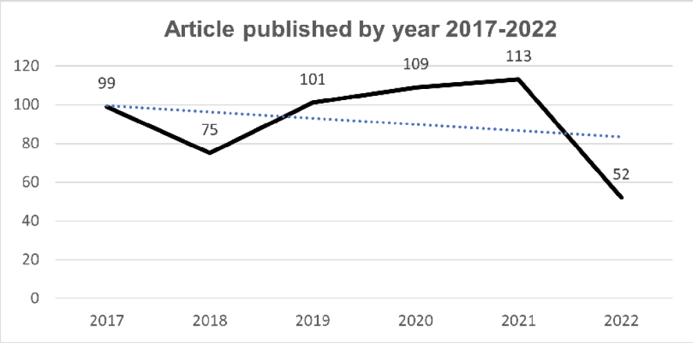 According to a web of science report, scientific research disclosures begin in 1999 and describe a progressive growth trend line on the subject, despite the fact that the creative industry is still growing. Figure 2 shows the last five years and four months (2017-2022). It shows us a growth trend of 6 articles per year in the period 2017 to 2021, however, the number of articles for 2022 forecasts an approximate of 156 articles for the 2022 management, this will increase the trend of article production to 11 per year.