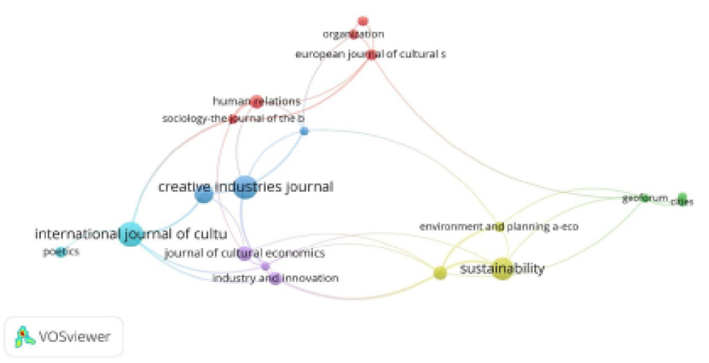 Figure 3 shows the journals with the most published documents, highlighting the journals "International Journal of Cultural Policy", "European Planning Studies" and "Creative Industries Journal", with the greatest strength of link to keywords. The journals "Journal Cultural Economics," "Industry and Innovation" and "Tecnovation" with the highest number of citations are also observed.