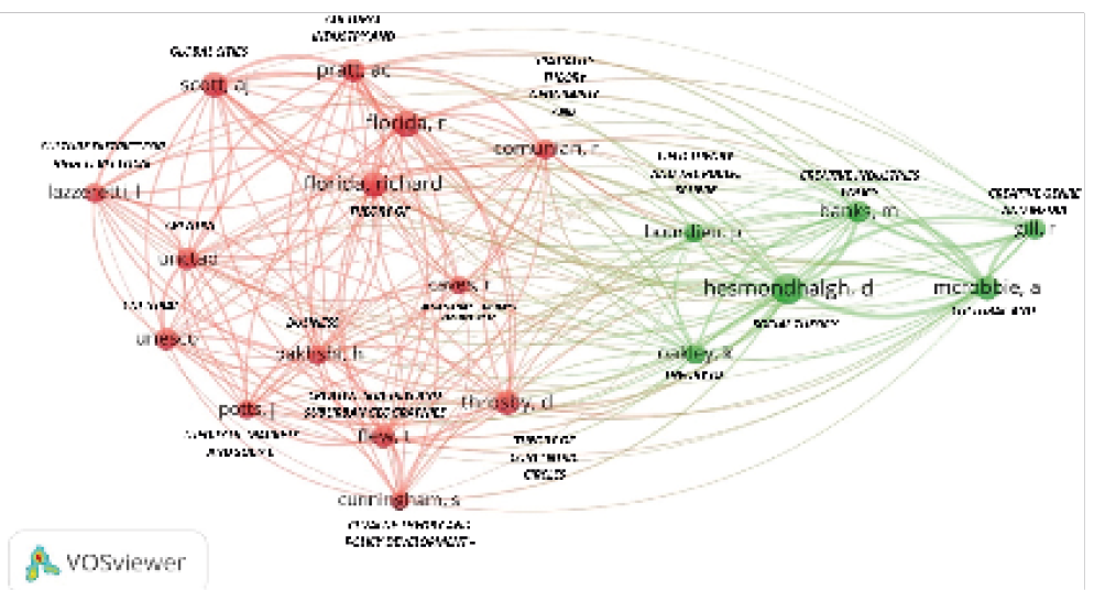 Two groups of cocitation networks were visualized describing two theoretical approaches: Creative-Cultural Classes Approach and Media and Culture in Society Approach, where the different authors converge to these two groups of approaches where the most outstanding authors have exposed their ideas. theoretical and are part of the first group thirteen authors and the second group are six different cluster authors with the influence of Florida R. and Hesmondhalgh, D.