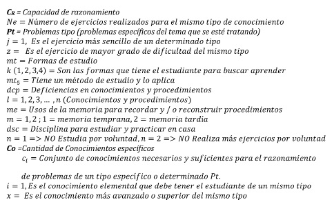 Una vez expresado todo lo anterior, se está en condiciones de plantear una expresión matemática que tenga la posibilidad de medir la cantidad de razonamiento que debe adquirir un estudiante para un aprendizaje específico como un primer intento de cuantificar esa capacidad para que posteriormente pueda resolver un determinado tipo de problemas matemáticos y de esta forma el docente pueda evaluarlo.