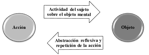 En la figura 1 se presenta de forma esquemática las acciones generales del razonamiento que el sujeto realiza sobre un objeto mental, en donde se destaca la actividad o acción ejercida por el sujeto sobre el objeto y la abstracción que realiza el sujeto una vez que ha realizado la acción sobre el objeto. “Ello justifica que asumamos el aprendizaje basado en competencias como un proceso centrado en la propia capacidad del estudiante, la estimulación de su responsabilidad y el desarrollo de su autonomía y el enseñar en términos de competencias […]” (Ruiz 2012, p. 14).