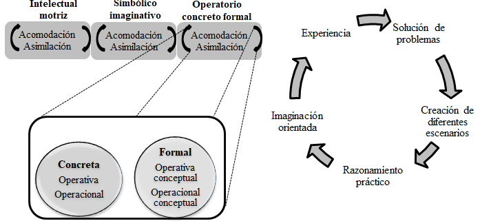 En la Figura 2 se muestra de forma esquemática, las estructuras cognitivas que, de acuerdo con la teoría psicogenética, ya han sido desarrolladas en el adulto y cómo en función de su experiencia, enfrenta problemas creando escenarios diversos; también se indica que mediante su experiencia puede dirigir su imaginación y aplicando un razonamiento práctico, busca diversas alternativas de solución para cada problema, al respecto dice Piaget e Inhelder (2007)