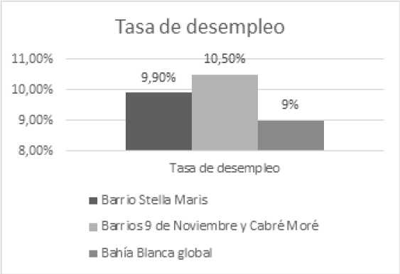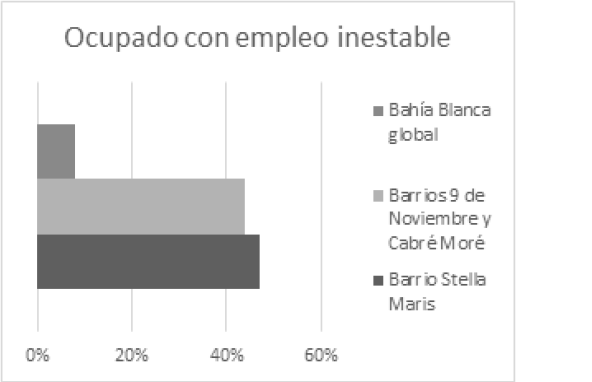 Figuras 1 y 2. Ocupados con empleo inestable y tasa de desempleo en los barrios Stella Maris, Cabré Moré y 9 de Noviembre.