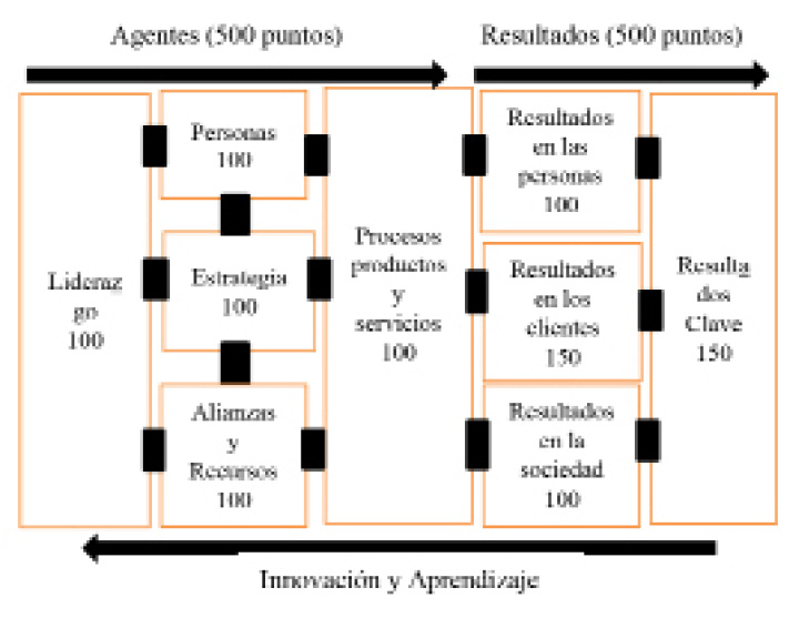 El modelo EFQM está integrado por nueve criterios: cinco agentes para el logro de la excelencia en la organización y cuatro criterios resultados que sirven para evaluar lo que se está logrando respecto a la excelencia. (Martin y Rodríguez, 2008).