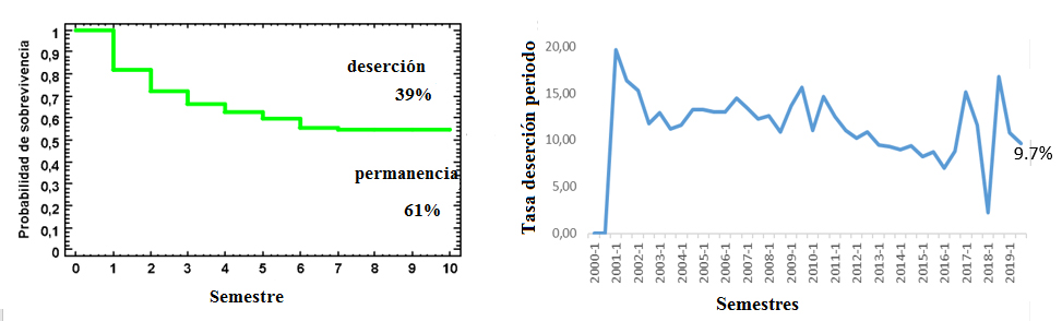 El comportamiento de la deserción a través de una cohorte se analiza a partir de una curva de sobrevivencia estimada, Figura 2 a); se puede observar que, en la Universidad del Quindío, como muy seguramente en otras universidades del país, existe una deserción temprana (aproximadamente 30% en los dos primeros semestres). La deserción por período se estimaba en 9.7% en el segundo semestre de 2019, Figura 2 b) y la curva de deserción por cohorte muestra una permanencia que llegó hasta el 61%.