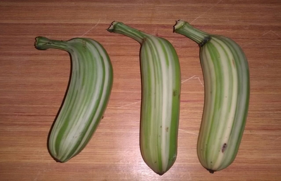 Se observó que el plátano pompo rayado (Manini) es una variedad que presentaba una apariencia diferente a otras musáceas, con franjas-rayas blancas típicas de la variedad, así mismo, esta variedad (Manini) presentaba un tamaño inferior, con una apariencia uniforme y robusta, dichas características son relevantes, pues al revisar en bases de datos no se encontraron estudios sobre esta variedad. El racimo estudiado de la variedad (Manini) presentó 8 manos y las demás variedades presentaron entre 5 a 7 dedos. En la Figura 1, se muestra la imagen del plátano pompo rayado.