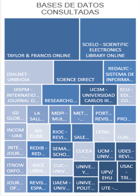 Para la investigación se recopiló información bibliográfica a través de las siguientes bases de datos: Scielo - Scientific Electronics Library Online, Taylor & Francis Online, Science Direct, Dialnet – Unirioja, Redalyc - Sistema De Información Científica, Science Direct, Proquest, Udes - Revista Científica, Salesiana, entre otras.