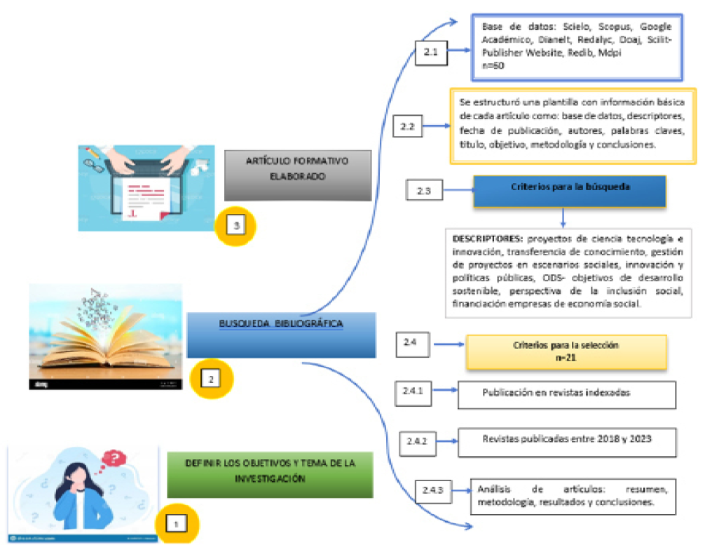 Inicialmente se realiza la selección del tema de interés a analizar que en este caso es la innovación, enmarcado en el contexto de Inversión Social; posteriormente se realiza búsqueda de información existente en las bases de datos electrónicas (e-Revistas) en el marco internacional, nacional y finalmente se articula la información de interés- análisis para la estructuración del documento.