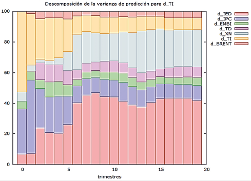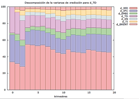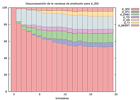 Ante los resultados descritos anteriormente, se realizó un análisis econométrico final, correspondiente a la descomposición de la varianza donde se encontró que los flujos de inversión extranjera directa que ingresan al país están dependiendo en gran parte de ellos mismos (Figura 2), es decir, son las dinámicas internacionales las que determinan que se ubiquen al interior del país, las empresas trasnacionales cuando están en fase de expansión empiezan a diversificar el lugar de sus inversiones, razón por la cual los países en vía de desarrollo tienen un gran atractivo, por lo que Colombia no los está atrayendo realmente sólo se beneficia de estas fases expansivas, por lo tanto, ante una caída de las IED a nivel mundial estas empresas simplemente abandonaran el país y sólo se quedan en aquellos realmente atractivos.