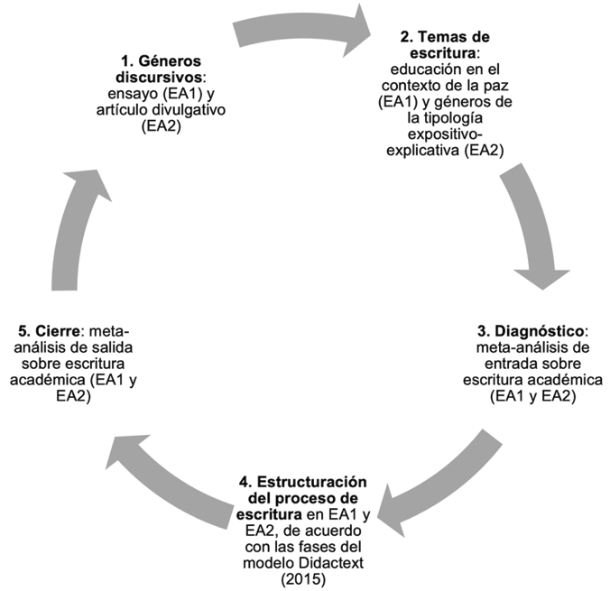 En otros términos, el desarrollo de esta competencia exige un conocimiento, no sólo de tipo lingüístico, textual, sociocultural y pragmático, sino también, procedimental, lo que permite potenciar el uso del lenguaje. En este marco, asumimos el desarrollo de la competencia escrita, alrededor de estrategias involucradas con procesos cognitivos y metacognitivos, elementos motivacionales y afectivos, que es posible materializar en fases recursivas, según Didactext (2003, 2015), para el desarrollo de propuestas de intervención en las diversas áreas del currículo (Writing across the curriculum, Writing in the disciplines).