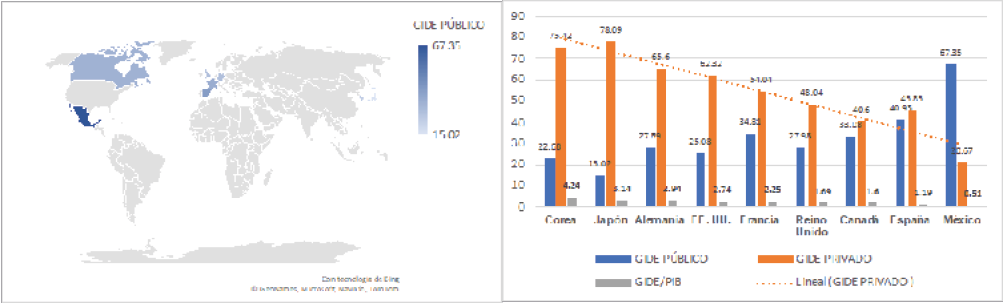 De ahí, que se demande que el sector privado sea un impulsor natural en materia de Gasto en Investigación y Desarrollo Experimental6 (GIDE) y, por consiguiente, se sume a la acción de gobierno en esta área para adecuarse al promedio de América Latina 0.55% (GIDE/PIB), dado que históricamente el promedio ha estado en 0.51%. Este porcentaje resultante del GIDE/PIB en México está muy alejado del promedio de la OCDE (2.35%), la cual pertenece desde el 18 de mayo de 1994, siendo México el miembro número 25 en ese entonces.