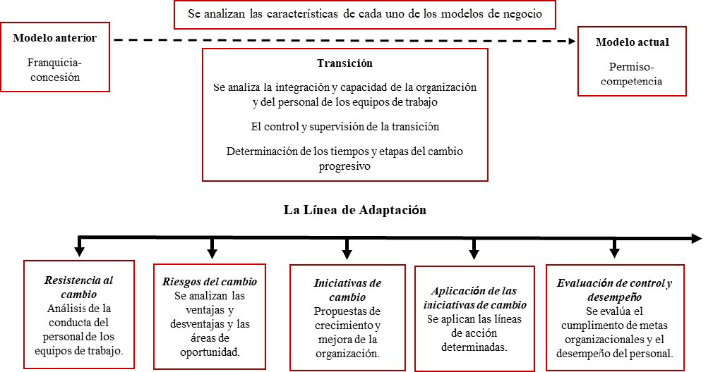 De acuerdo al estudio presentado, aprovechando la experiencia de las compañías analizadas, se puede sugerir un esquema de gestión para la adaptación al cambio organizacional de una estación de servicio al nuevo modelo de negocio permiso-competencia, que permita identificar los componentes de investigación y análisis que se propone para las estaciones de servicio que aun han aplicado el cambio de modelo de negocio de manera homogénea, donde estas mismas, podrán obtener beneficios considerables.