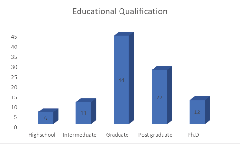 44% of the respondents were graduates, 27% postgraduates and 12% had doctorates. The pool also consisted of 11% and 6% pupils who had completed their intermediate and high school education respectively.