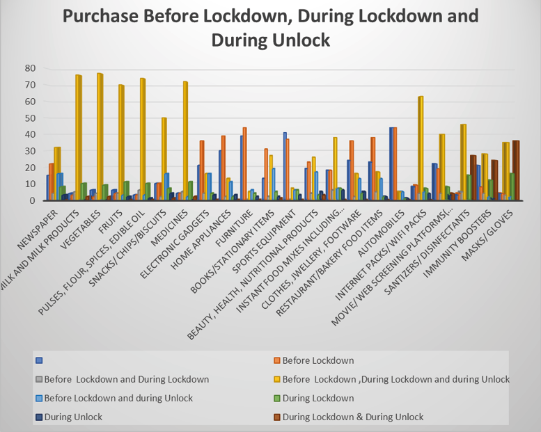It was seen that there was a drastic shift in the consumer behaviour and purchase habits of customers during Covid-19 pandemic and most of these changes would continue in the post pandemic period also. It was seen that the purchase of basic need items had no change in the before lockdown, during lockdown and during unlock period like milk & milk products, vegetables, fruits, pulses, flour, spices, edible oils, snacks, chips & biscuits. Purchase decreased for certain products like newspaper, furniture, electronic gadgets, home appliances, books/ stationary, sports items, beauty, products, clothes, jewellery, footwear, automobiles, restaurants etc during lockdown period. Purchase increased for certain products like Medicines, Immunity boosters, masks, gloves, Internet/net packs, health & nutritional products, sanitizers, disinfectants etc. This shows that people are more concerned about the health & sanitization products. During lockdown the consumption of net packs and internet increased as many people started work from home jobs and education.