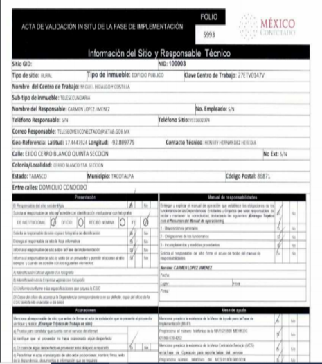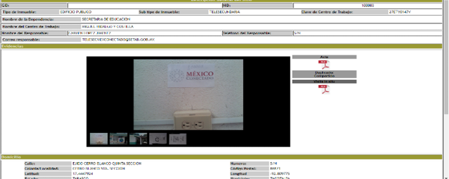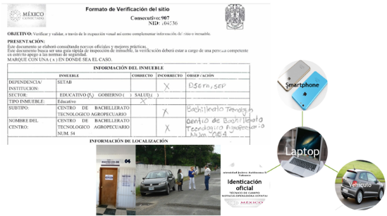 La muestra de estudio de 4,754 sitios fue definida de un universo de 12,147, los cuales se deben de validar usando dos instrumentos. El primero es una validación física del inmueble de 2,257 sitios, concentrando información básica para su identificación (fotos, responsable del sitio, georreferencia, domicilio, entre calle, tipo y subtipo de inmueble, dependencia responsable, longitud, latitud, datos de contacto, clasificación del tipo de localidad, tipo de acceso, responsable directo y responsable indirecto, municipio, localidad, tipo de población, numero de habitante, servicios básicos -Luz y seguridad en el inmueble-, región), equivalente al 47% de la muestra definida por los comités. En la fig. 3. Se muestra parte del instrumento utilizado, herramientas colaborativas y evidencias que describe y validad el sitio o inmueble propuesto para ser propuesto para recibir conectividad de internet.