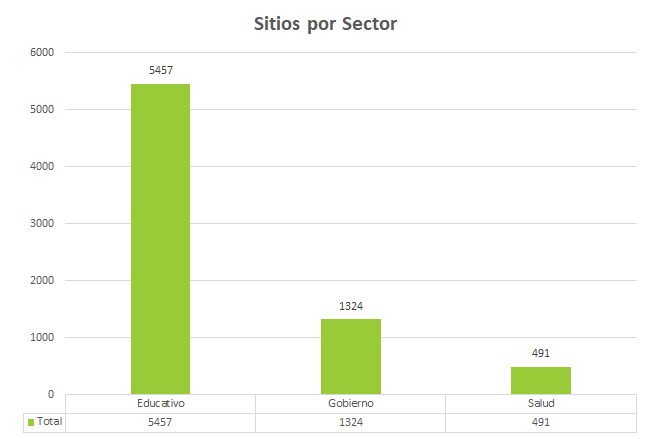 Luego de recabada la información de los dos cuestionarios, se procedió a integrar los 78 ítems en una sola base de datos empleando la herramienta Oracle, con el fin de ordenar de forma sistematizada la respuesta de los encuestados e integrar el expediente electrónico de cada sitio y espacio público validado. Los sectores beneficiados dentro del Proyecto México Conectado en la entidad son: Educación, Salud y Gobierno, los cuales se muestran en la Gráfica 1, indicando el número de sitios propuestos por sector, siendo el sector educativo el más beneficiado. De esta último análisis, revisión y validación se conformó el universo final de sitios propuesto para recibir conectividad, la cual da apertura a la fase de licitación estableciendo un volumen de 7,272 sitios y espacios públicos (IOE Tabasco, 2014, págs. p 66 - 68).