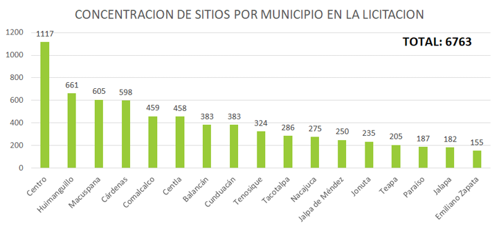 De los 7 mil 272 sitios propuesto para recibir conectividad, se identificaron 509 (7%) cuenta con alguna conexión a internet y 6 mil 763 sitios carecen de este servicio. De conformidad con la cifra presentada, se estima con la implementación del PMC en el Estado de Tabasco, se logrará proveer de conectividad a cada uno de los sitios y espacios públicos que fueron propuesto, lo que permitirá al Estado de Tabasco pasar del lugar 28 nacional a los primero 10 lugares en acceso a internet de banda ancha. En Gráfica 3, se muestra la distribución de sitios y espacios públicos por municipios y por dependencias. (Gobierno de la República G. d, 2014; INEGI, 2014.).