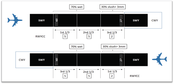 A key change in the GRF is the introduction of RYWCC. RWYCC reflects braking performance as a function of runway surface conditions. RWYCC is a code describing the runway surface condition at numbers 0 to 6. Codes are specified in triple codes starting from the landing or take-off direction of the runway to give information about a third of the runway as shown in Figure 3. With this information, flight crews are allowed to determine the stopping distance of the aircraft under current conditions from the performance information provided by the aircraft manufacturer. Figure 4 shows the correlation between RWYCC and the pilot reports (ICAO, 2020b).