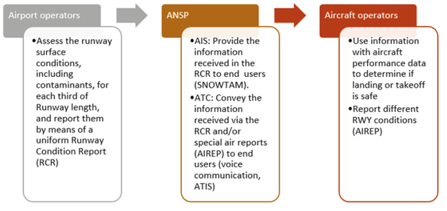 GRF includes all stakeholders involved in the process of collecting data, converting data into structured operational information, and communicating structured information to end-users for assessment and reporting of runway surface conditiox|ns (ICAO, 2019b). Airport operators, air navigation service providers (ANSPs) and aircraft operators are the main stakeholder organizations in the GRF process. The flow of information between these stakeholders is shown in Figure 6.
