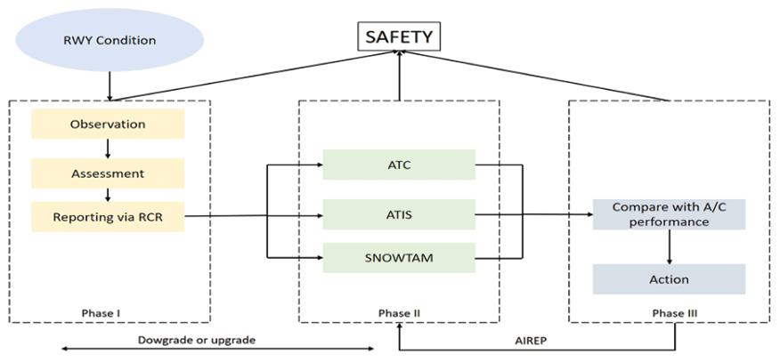 GRF concept consists of assessing the runway with a matrix through human observation and reporting a Runway Condition Report (RCR) with Runway Condition Code (RWYCC). RWYCC is complemented by a description of the contaminated material for each third of the runway, based on its type, depth and coverage. It is used to complete a standard report called Runway Condition Report (RCR). RCR is transmitted to air traffic control (ATC) services and aviation information services (AIS) for transmission of the result of the assessment and the relevant RWYCC to pilots. Pilots use RWYCC to determine braking and directional control by correlating it with performance data provided by the aircraft manufacturer. This allows pilots to accurately calculate landing and take-off performance on contaminated runways. Another important element of the GRF is the process allowing pilots to report their observations of runway conditions, approving the RWYCC or providing a warning to changing conditions (ICAO, 2021a).