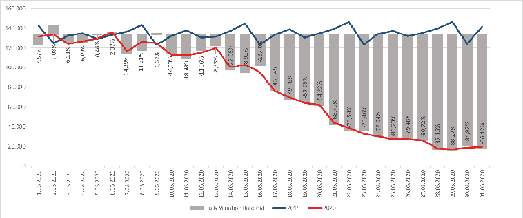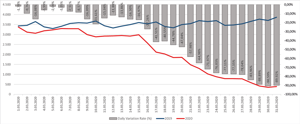 By the spread of the pandemic, there was a 1.78% decrease in air traffic in Turkey at the beginning of March 2020 compared to 2019 data. With the declaration of flight restrictions to 11 countries, including Germany and France on March 14, 2020, in addition to the previously announced countries, serious decreases began to occur in the number of traffic, and as shown in Table 3, it was up to a decrease of 89.92% at the end of March 2020.